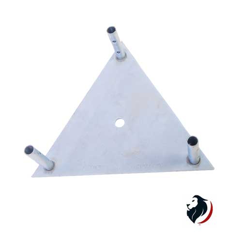 Base triangular que garantiza máxima estabilidad para la torre, con dimensiones de 45 cm por lado y dado de concreto de soporte de 80×80 cm y altura de 100 cm.